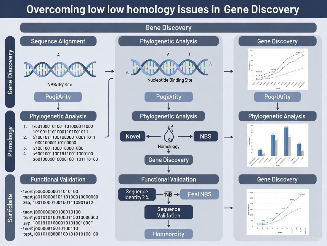 Nucleotide-binding site-leucine rich repeat (NBS-LRR) genes represent the largest family of plant disease resistance (R) genes, playing crucial roles in pathogen recognition and defense activation. However, the discovery of novel NBS genes is frequently hampered by low sequence homology across plant species, creating significant bottlenecks in resistance breeding programs. This technical support center addresses the specific experimental challenges researchers face when working with these rapidly evolving gene families, providing targeted troubleshooting guidance for overcoming homology-related barriers.