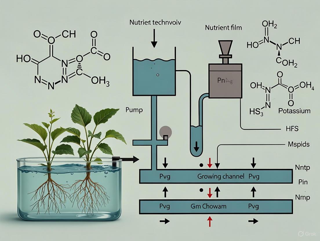 The Nutrient Film Technique operates on the principle of a continuous, shallow flow of nutrient solution over plant roots. In an NFT system, plants are supported in sloped channels, typically made of food-grade plastic, with their root systems suspended in the channel [6] [7]. A thin film of nutrient-rich water is pumped from a reservoir to the higher end of the channel and flows by gravity down the slope, creating a shallow stream that bathes the roots before being recirculated back to the reservoir [1]. This design ensures that the roots have simultaneous access to nutrients from the water film and oxygen from the air-filled portion of the channel, promoting efficient nutrient uptake and healthy plant growth [7]. The system's core components include the growing channels, a nutrient reservoir, a water pump, and tubing for circulation [7]. A key operational requirement is the maintenance of a consistent flow; even brief interruptions can rapidly lead to root drying and plant stress [1].