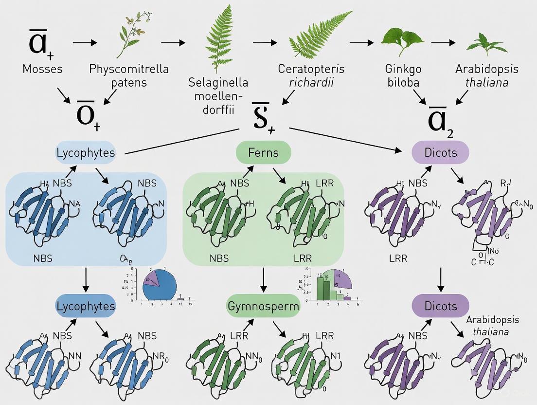 Figure 1. Evolutionary trajectory of NLR genes in plants. The diagram traces the origin of NLR building blocks to green algal ancestors, followed by key diversification events during plant terrestrialization and subsequent lineage-specific evolution.