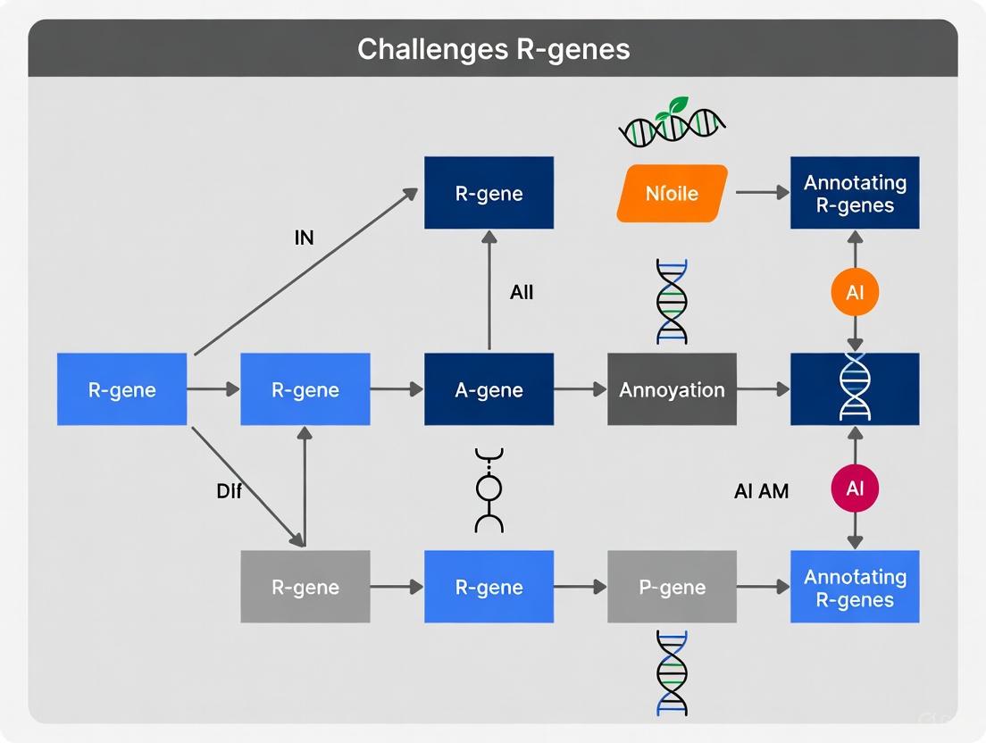 Accurately annotating Resistance (R) genes in plant genomes is a critical but formidable challenge for researchers in genomics and drug development. These genes, which encode key immune receptors like NLR proteins, are notoriously difficult to identify due to their complex genomic architecture, repetitive nature, and limitations of automated annotation pipelines. This article explores the foundational biological hurdles, reviews cutting-edge methodological solutions from homology-based to deep learning pipelines, provides best practices for troubleshooting and optimization, and establishes a framework for the validation and comparative analysis of R-gene predictions. By synthesizing current knowledge and emerging trends, this guide aims to empower scientists to more effectively mine plant genomes for these valuable genetic resources, thereby accelerating crop improvement and the discovery of plant-derived therapeutics.